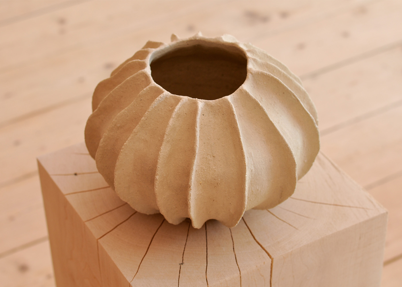 The piece Fladstrand no I is hand built in stoneware. It is glazed inside, so it works as a decorative object as well as a vase.